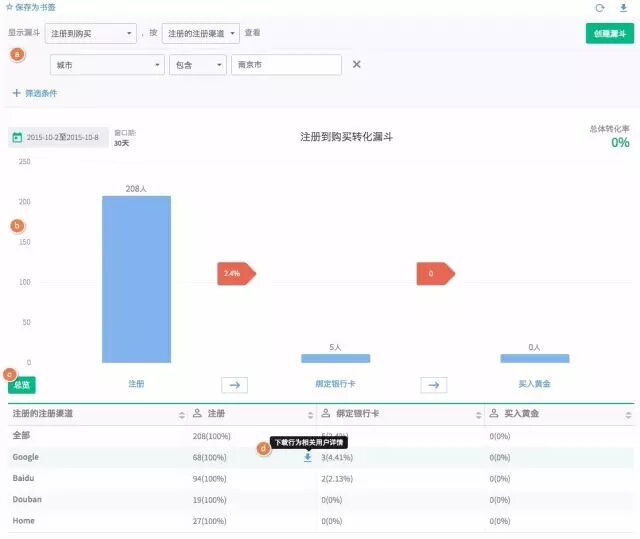 一个用户在百度和优酷分别投了10万的广告,百度带来1000个客户,优酷带来500个。桑文锋说,很多平台的分析就止于此了,但神策数据可以分析出从不同渠道而来的客户,哪个渠道的客单价更高,哪个渠道的留存更高。