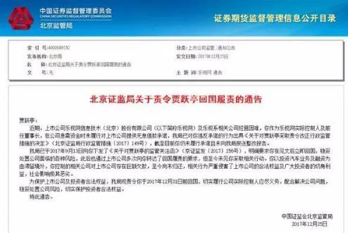 北京证监局12月25日挂出一份《北京证监局关于责令贾跃亭回国履责的通告》(下称《通告》),表示责令贾跃亭于2017年12月31日前回国,切实履行公司实际控制人应尽义务,配合解决公司问题,稳妥处置公司风险,切实保护投资者合法权益。