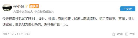 另据了解,就在12月23日当天,盛大文学原CEO、火星小说创始人侯小强曝料称,他近期在洛杉矶试驾了FF91,并见到了贾跃亭及其妻子甘薇,且发声力挺。