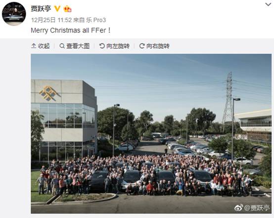 昨天圣诞节,此前静默了一段时间在美造车的贾跃亭发声了:一张FF员工拥围着7辆FF91电动车欢度圣诞节的合影,配文“Merry Christmas all FFer!”