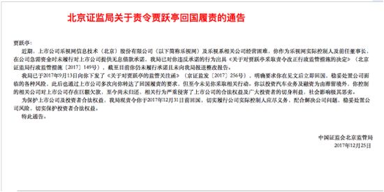12月25日,北京证监局对贾跃亭作出通告,责令其于12月31日前回国,以履行公司实际控制人应尽义务。然而,又有几人会相信老贾真的这么听话?