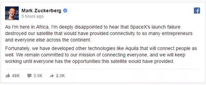 发射卫星这事能不能成功都是五五开的,没有哪个国家能100%的成功,但扎克伯格并不这么认为,事情发生后立马表态: