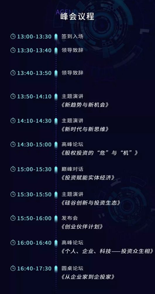 峰会秉承传统,革故鼎新,携手行业知名学者与重磅嘉宾,解析政策趋势、聚焦投资策略、探索价值发现、前瞻市场未来。并通过主题分享、圆桌论坛、大佬对话等多样化形式,就核心议题展开深入探讨,议题涉及股权投资的“危”与“机”、投资赋能实体经济、硅谷创新与投资生态、新经济下的投资新趋势、新机会、新时代与新思维等。
